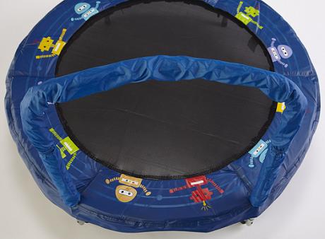 Get your little one up and jumping with the 48" dark blue kids trampoline with an array of robots to cheer them on as they jump. The handle easily adjusts to two different sizes and the mat is held up with 30, 3.5" galvanized steel springs. The rust resistant galvanized steel frame is easy to assemble and the padded handlebar keeps users safe. Size: 48" in diameter Holds up to 100 lbs Shipping Included