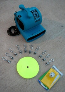 Tether tie downs for the inflatable are included with the blower package. - 3000lb breaking strength for tether strapping. - 150' to 450' length of tether depending on balloon size. - 4 to 16 (depending on balloon size) cambuckles for easy adjusting and positioning of balloons. - 4 to 16 (depending on balloon size) snap hooks for easy hooking and unhooking of tether straps. - 4'x8' Tarp to cover blower.