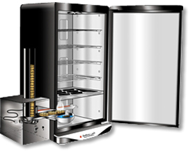 smoke generator in which flavor wood chip bisquettes are burned for 20 minutes each so that the temperature does not fluctuate, thus eliminating the high temperature gases, acids and resins that can distort the flavor of smoked food. It is light enough to carry and is about the size of a small fridge.