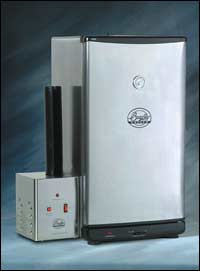 smoke generator in which flavor wood chip bisquettes are burned for 20 minutes each so that the temperature does not fluctuate, thus eliminating the high temperature gases, acids and resins that can distort the flavor of smoked food. It is light enough to carry and is about the size of a small fridge.