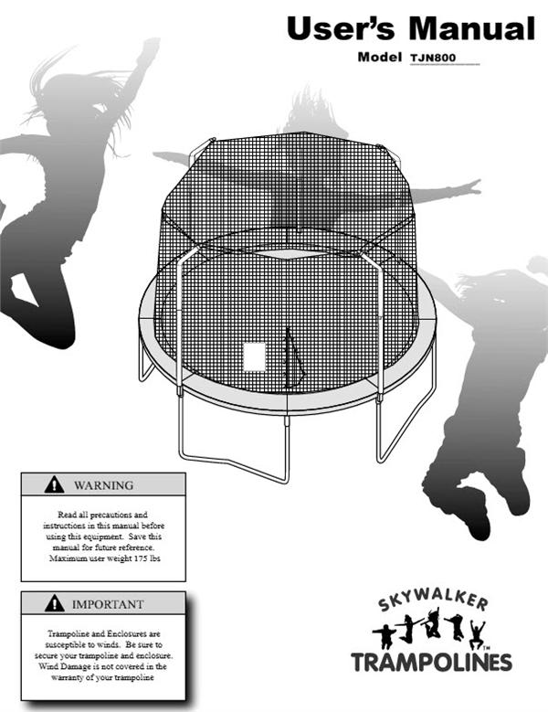 Combo Manual for the 8' SKYWALKER Models SWTC8 & TJN800 This manual includes trampoline and enclosure instructions To access your manual quickly, please pay with Paypal during checkout. After you receive your order confirmation email, the next email marked "Payment Received" will have a download link to your manual.The link is valid for 3 days. The manual should be immediately downloaded onto your computer or printed out for future reference.