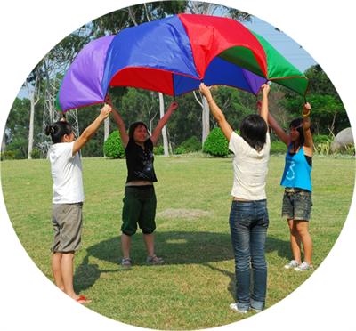This multi use parachute can be used for a ground cover for sitting at the park or beach. The 10’ size is large enough for 4 kids to play at once. 4 balls are included to use when playing with the parachute. The Parachute is made of durable fire retardant polyester to last for years. Webbing handles are sewn to the perimeter seam.