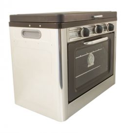 This Camp Oven has just what every camp needs to enjoy superior eating in the outdoors – compact size, portability and raw cooking power. Don't let its compact size fool you. The Outdoor Camp Oven features more than 14,000 total BTU of cooking energy. Twin burners and a spacious oven have plenty of power to get your cooking/baking done the way you like it, right there in camp. The unit uses a disposable 1-lb. propane tank, or it can be adapted to use a 20-lb. tank for increased cooking time. The range's dual burners put out a whopping 5,300 BTU per burner. The oven heats at 3,500 BTU per hour with a maximum temperature of 400°F. Two oven racks allow you to cook your main meal and dessert at once. An oven thermometer helps keep heat constant and monitors your meal's cooking progress. The matchless burner igniters mean you won't have to fumble for a lighter or matches while in the field. The stove's folding lid and carry handles were designed with portability in mind, so it's easy to get into and out of camp. Stainless steel construction resists corrosion for years of cooking without problems. Nonstick enamel cooking surface makes cleaning swift and easy with just soap and water.